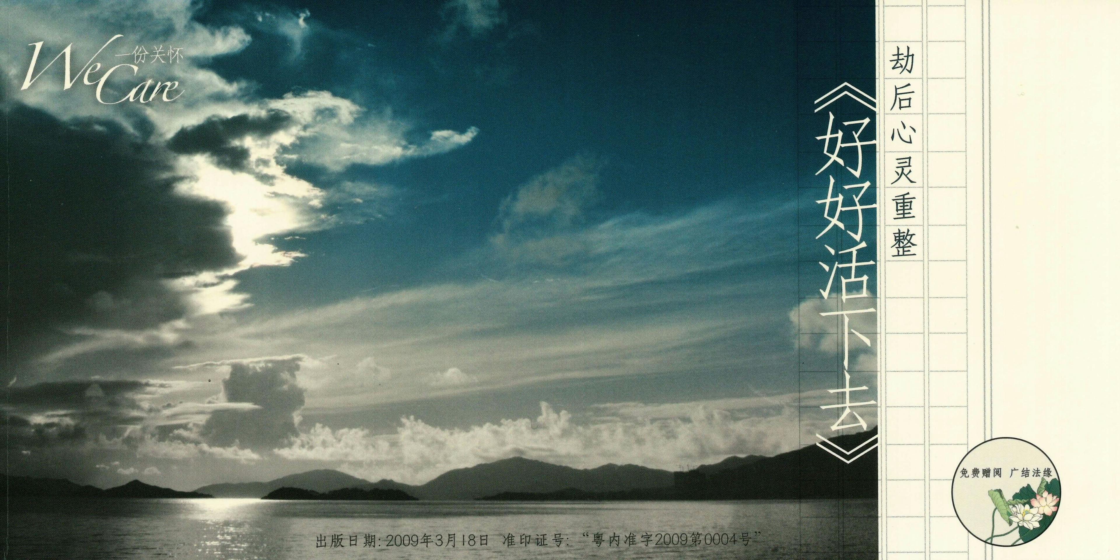 「大地無情,人間有愛;一方受難,八方支援」一場黎克特製八級的四川大地震,摧毀了無數家園,奪走了不少寶貴性命。地動人心,身在香港的我們除了可為四川的同胞募捐和祝福以外還可以做甚麼?塌毀了的家園可以重建,但重整受創的心靈更為重要。「一份關懷」(WE CARE)工作小組希望透過《好好活下去》心靈本子,為受災同胞的內心,帶來一點的光明和希望,與及我們由衷的關懷和祝福。